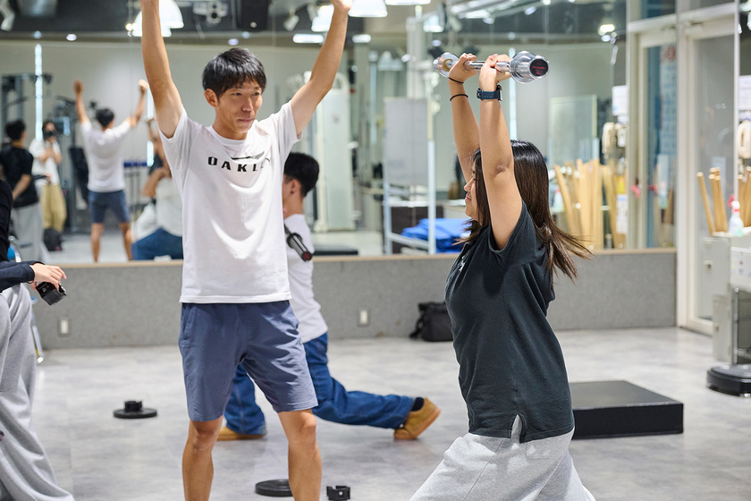 授業では、トレーナーとして必要な「実践的トレーニング」と「指導スキル」の両面をテーマとして扱います。まず学生自身が多様なトレーニングを体験し、身体づくりの基礎を実感。その体験を踏まえてトレーニングメニューを設計し、実際に仲間へ指導するロールプレイを行います。正しいフォームの見極め方や、安全に配慮した指導方法、声かけの工夫など、現場で求められるスキルを実践的に習得します。また、振り返りやフィードバックにも力を入れ、指導者としての伝え方やコミュニケーション力を段階的に高めていきます。