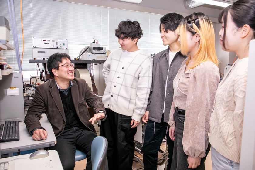 有機半導体の研究は、物理と化学、電気・電子工学など、さまざまな分野が交錯する場なので、固体物理学や量子力学などの基礎知識も必要となります。今まで触れてこなかった分野への抵抗感のある学生に対しては「そのギャップを埋めるために早い段階から研究論文に触れてもらい、理解できない部分を一つずつ埋めていくことに力を注いでもらいます」と田中先生。また、実際に有機分子を用いたトランジスタの作製・測定などを通じ、実験の難しさと面白さを早期に体感するとともに、安全に実験を進めるための技能を身に付けていきます。