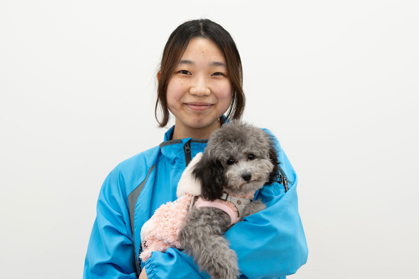 子どもの頃から動物が好きで、自分の手で動物をキレイにしてあげたいと思っていました。本校はトリミング実習時間が多く、技術を身につけやすいことに魅力を感じ入学しました。入学後も好きな授業はトリミング実習です。将来はお客様に安心して任せてもらえるサロンを持ちたいです。
