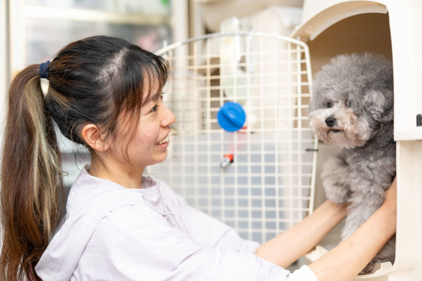 トリミングを中心に、ペットホテルに泊まるワンちゃんのお世話などをしています。常連のお客様が多く、ワンちゃんの体調や体格の変化に気を配りながらトリミングをしています。入社当時に担当したパグの子犬が、私を指名してくれた最初のお客様。来店のたびに私の顔を見るとご家族に嫉妬されるほど喜んでくれるようになりました。飼い主さんにも仕上がりにご満足いただき、双方の幸せそうな顔を見ることがやりがいになっています。ワンちゃんにとって『ご家族の次に大丈夫な人』でいられることがとても嬉しいです。初めはトリミングを嫌がる子もいますが、優しく接しながらワンちゃんにとって安心できる場所にしたいと思っています。
