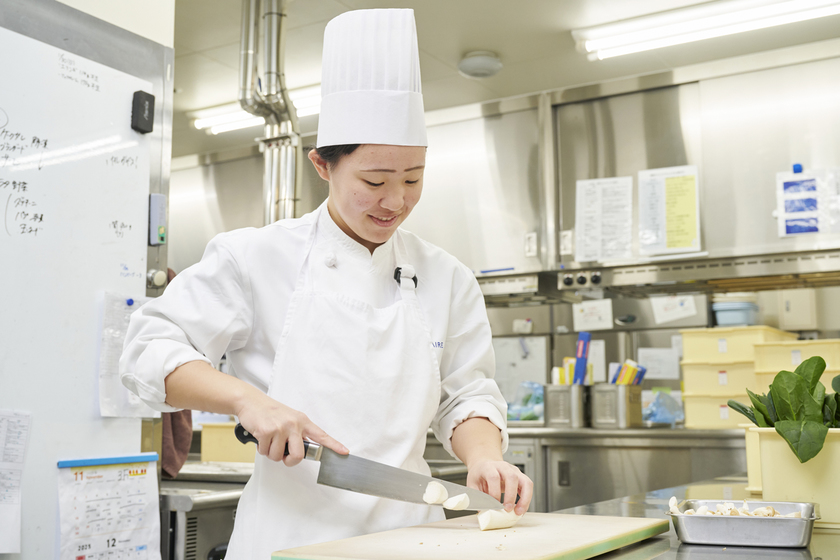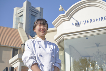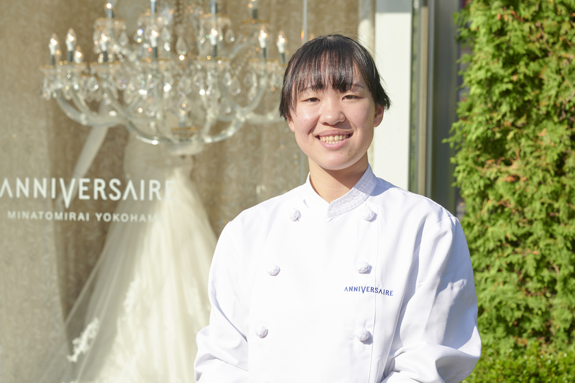 アニヴェルセル株式会社 みなとみらい横浜メゾン勤務/調理師科 昼間部 卒/2025年卒/進路選択時、調理師が行うかつら剥きの美しさに感銘を受け、調理の道を選択したという三嶋さん。先生の優しい空気感や、和・洋・中を一年で学べることに惹かれて横浜調理師専門学校へと進学。就職活動では、企業説明会での「一生に一度のお皿を提供する」という言葉が心に刺さり、記念日に寄り添える調理師になりたいと、現職場へ就職したそう。「職場は和やかな雰囲気で、終業後は休憩所で談笑することも。教わることが多い立場ですが、内定者アルバイトに仕事を教える場面もあり、理解しやすいスピードや説明を心掛けています」。