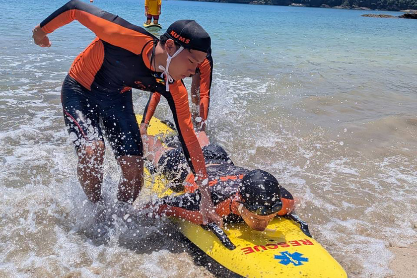 合宿で実習を行うのは、「日本の快水浴場100選」にも名を連ねるビーチ。シカやサルの姿も見られるほど自然豊かな環境での訓練はやりがいも大きいです。ここでの実習を通して、水難事故に対する「危険を予測し未然に防ぐ力」、「自らの身を守り管理する力」、さらに「バイスタンダーとして求められる最低限の救助技術や救急蘇生法」の修得を目指します。また、集団生活の中で団体行動や時間管理、規律・礼儀も体得。3カ月間の事前学習を経て臨む合宿だからこそ、学生同士の絆も深まり、強いチームワークの醸成へとつながっています。