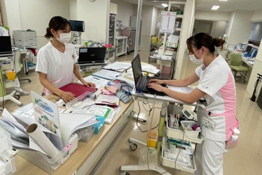 リハビリ支援、退院支援、オペや看取りまでの幅広い分野で、看護師として病棟で患者様の状態管理や処置等を行っています。やりがいがすごくある仕事で、自分が担当した患者様が状態が良くなった時や退院したとき等に、「あなたが担当でよかった」といってもらえた瞬間は特に達成感を感じます。私は誰と話すときも常に笑顔で、話すときは視線を合わせる、相手にあわせて声掛けをするようにしています。それは、どの人も不安や心配を抱えて入院されるからです。その不安や心配を取り除けるのは一番近くにいる看護師だと思うので、安心して不安も言っていただけるように環境を整えられたらと思います。