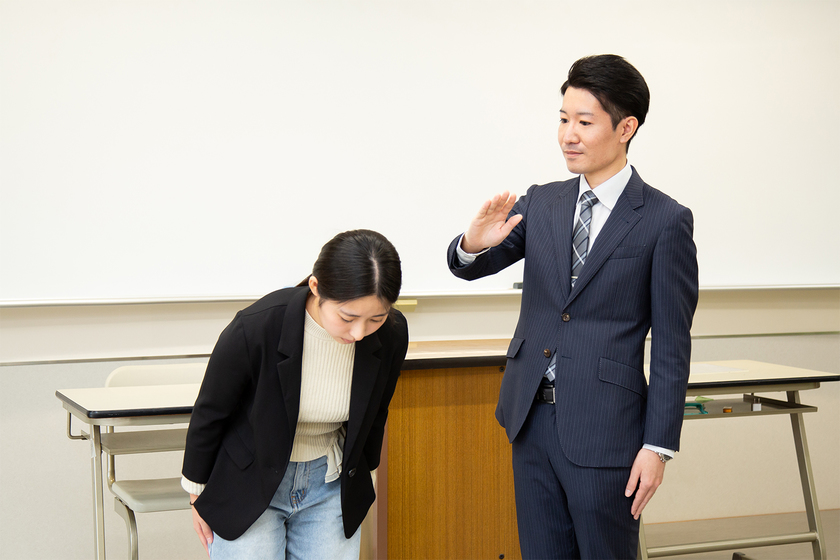 お辞儀の角度や姿勢、目線の置き方まで、相手に好印象を与える所作を一つずつ練習。
