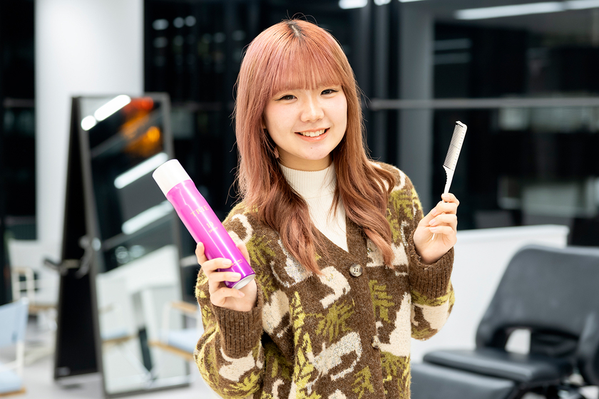 小さい頃から、人形のヘアアレンジをするのが大好き。友人のヘアアレンジもよくやっていて、中学生の頃から「ヘアメイクの仕事をする!」と決めていました。この学校を選んだのは、少人数制で学べる学校だからです。