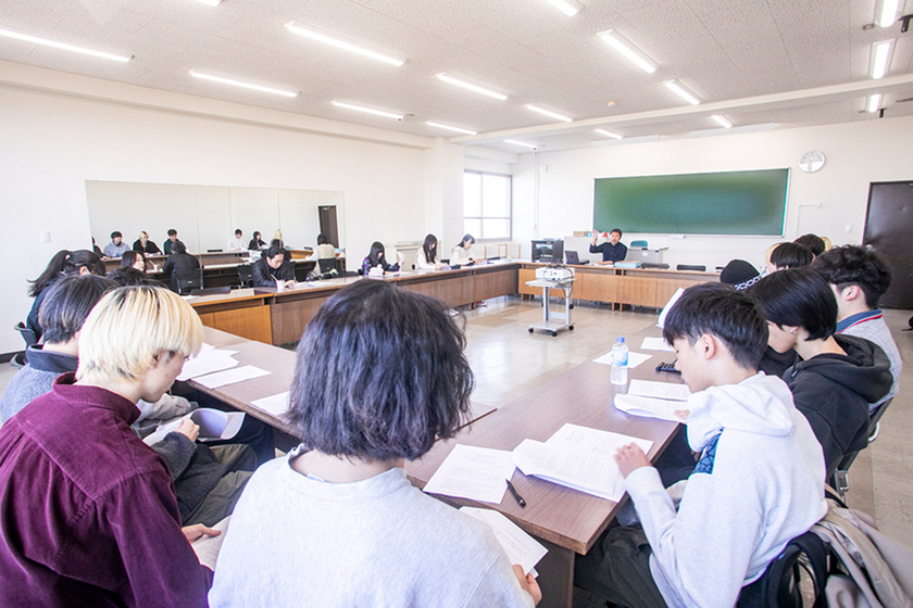 授業では、高校までの受け身の学習とは異なり、自身の関心に沿って学んでいる実感が得られる雰囲気が広がっています。学生同士の意見も多様で、異なる価値観に触れることが刺激となり、議論を楽しむ姿が見られる。南先生は授業外でも気軽に研究室を訪ねやすく、哲学の話題はもちろん、日常の相談にも耳を傾けてくれる存在です。哲学によって物事の見え方が変わる面白さを知り、学びをさらに深めたいと前向きに将来を描く学生も多い。