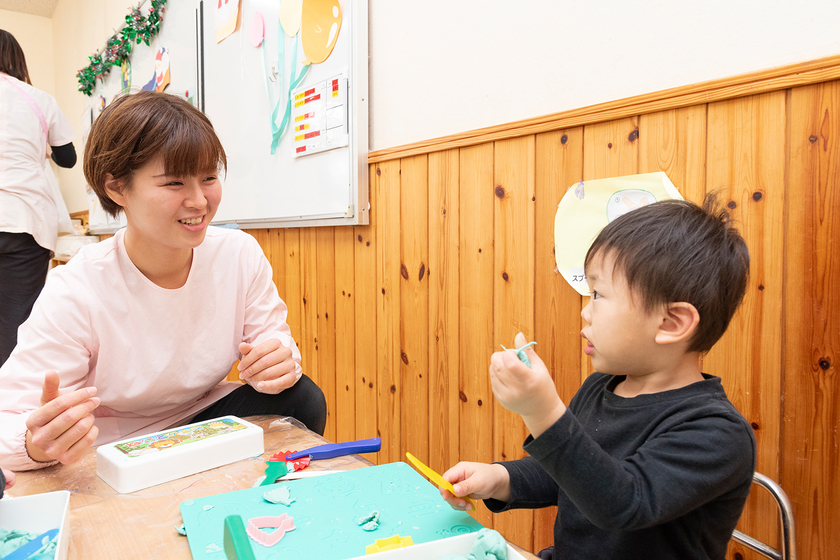 ずっと憧れていた「浅香こども園」に就職し、充実した日々を過ごしています。入職1年目ですが、信頼できる先輩のもと、すでにクラス担当として活躍中。遊びや食事、運動、お片付けなどを通して優しく成長に導くのですが、一人ひとりの表情や仕草が可愛くて、保育の仕事を選んで良かったと毎日実感できます。私は2歳児クラスの担当で、子どもたちの「初めてできた体験」をたくさん共有できるのも大きな魅力。トイレトレーニングで上手くできたときは「やったね!」と笑顔を交わし、保護者の方に報告する際にも喜びを分かち合えます。業務を通してスキルアップし、子どもたちや保護者の方、仲間に信頼される先生になることが目標です。