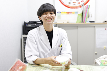 患者さんへの栄養指導と、NST(栄養サポートチーム)業務を担当しています。患者さんの病態や生活スタイルはさまざまなので、栄養指導では対話を通じて患者さんを理解することが第一歩。塩分や糖質などの制限が必要な場合もいきなり禁止するのではなく、徐々に量を減らし、代わりとなる食材を伝えるなど、実践しやすい提案を心掛けています。またNST業務では、医師や看護師らと行うカンファレンスに参加し、患者さんの食事の方針を検討するほか、必要があれば病室を訪ねて話を聞き、好きな食材や、状態に合う栄養補助食品を献立に取り入れています。栄養状態が改善し、患者さんが元気になっていく姿を見られるのが、何よりのやりがいです。