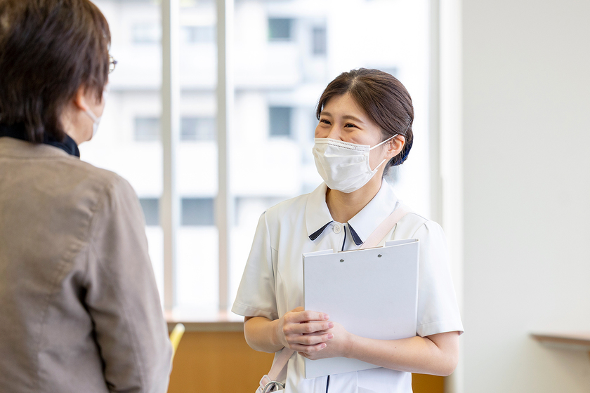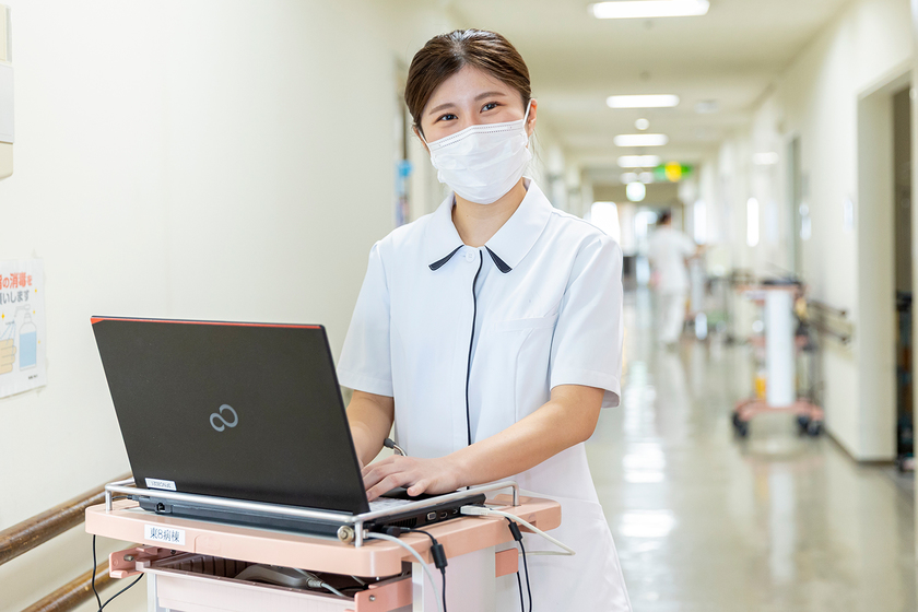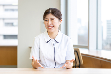 呼吸器科の病棟に勤務し、肺気腫や肺がんなどの患者さんを中心に看護しています。病名が同じでも、症状や必要なケアは異なるので、カルテを読み込み、積極的にコミュニケーションを取りながら、最適な看護を考えます。化学療法中の患者さんの場合、アレルギー症状や副作用を随時チェックするほか、食欲が落ちている場合は管理栄養士と連携して食事内容を調整したり、痛みがある場合は薬剤師や緩和ケアチームと連携して苦痛を和らげるなど、一人ひとりの心身の状態に寄り沿い、退院まで支え続けます。患者さんが元気になる姿を見られるのは何よりうれしく、退院時に患者さんやご家族に感謝していただけることが仕事の励みになっています。