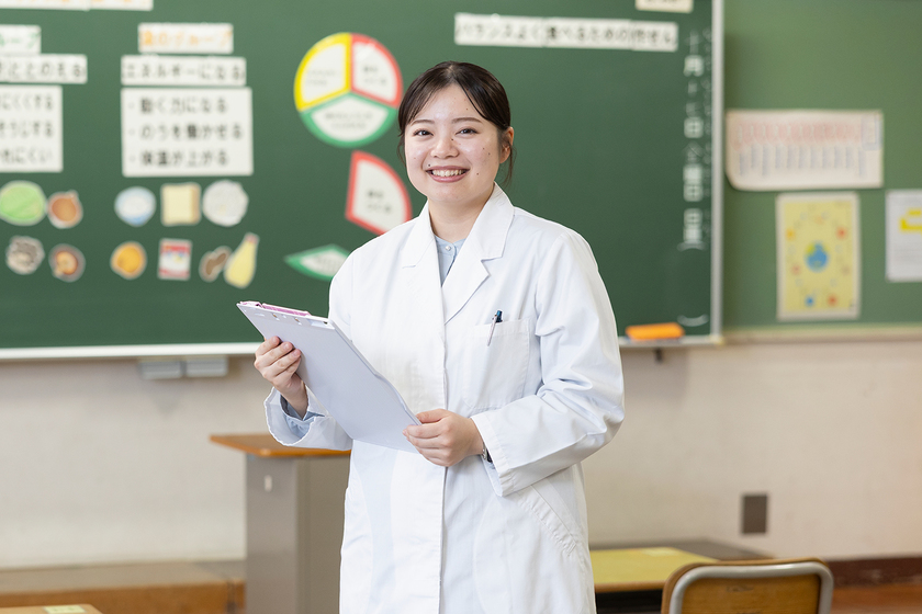 管理栄養士や栄養教諭に求められる専門知識を実践的に学びました。例えば「給食管理実習」では、栄養価や予算、衛生管理などの条件を考慮しながら100人分の献立や調理手順を考え、「応用栄養学実習」では、食物アレルギーを持つ人のための献立作成、調理、試食を経験。ゼミナールでは食育をテーマに、子どもの年齢に合わせた食事教室の内容や教材を研究しました。こうした学びをもとに臨んだ小学校での「教育実習」では、授業を通して朝食の大切さを楽しく伝えることができたと思います。子どもたちが給食を楽しみにする姿や、「先生になって私たちの学校に来て」という言葉に感激し、子どもの元気を支える栄養教諭になることを決心しました。
