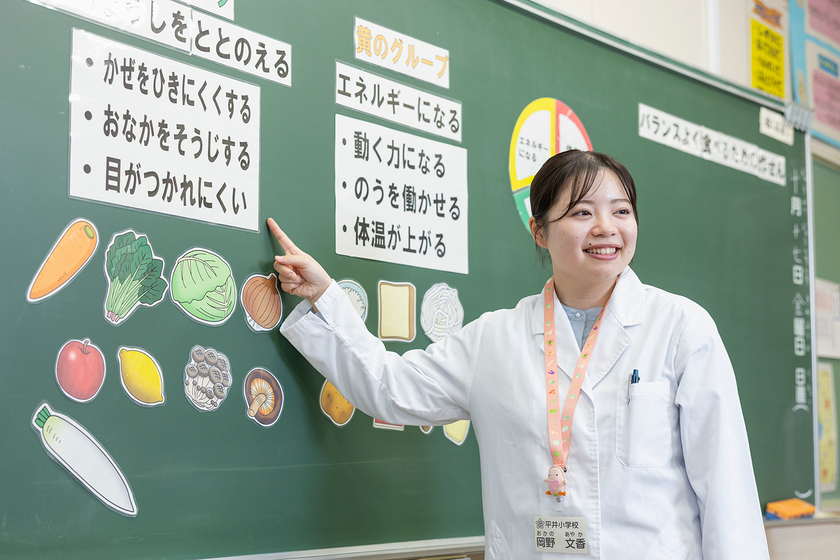 小学校の栄養教諭として、子どもたちへの食育に取り組んでいます。栄養教諭の主な仕事は、給食の時間に食材の産地や旬の話で食への興味・関心を広げ、授業を通して栄養の大切さを伝えること。イラストや写真を使い、楽しんで学べるよう工夫しています。また、給食センターの管理栄養士も兼務しており、栄養価はもちろん、季節感や食べやすさを意識した献立や、食物アレルギーに関する資料などを作成するほか、調理場で作業や味付けの確認をし、おいしくて安全な給食づくりを徹底しています。「おいしかった」「全部食べたよ」という声は何よりの励みです。生涯にわたって子どもの健康を守る食習慣を、これからも楽しく丁寧に伝えていきたいです。