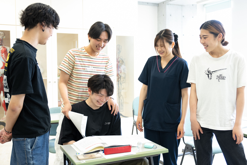 柔道整復理論は暗記するものが多く「単に言葉を覚えるだけでなくイメージすることが大事」と、自分や学生の身体を実際に動かしながら教えたり、穴埋め形式や図を入れるなどオリジナルのプリントを作成して配布している。座学中心ながら実習や補講も実施し「難しい内容のことも、学生が楽しめて、興味を持って取り組んでもらえるように」と工夫している。併設している接骨院に週3回ほど勤務しており「実際の施術の中で学ぶことがたくさんある」と長谷川先生。現場の様々な経験を学生にフィードバックできることも先生の強みとなっている。