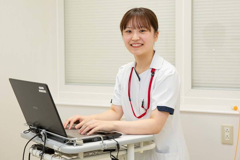 公立学校共済組合 九州中央病院/第1看護学科/2024年卒/九州中央病院の急性期病棟で、手術前後の患者さまを担当している山本さん。日々バイタルサインの確認や会話を通して、身体面・精神面はもちろん、生活背景まで丁寧に汲み取る看護を大切にしている。ベッドサイドでは目線を合わせ、ゆっくりと対話することも忘れない。「命の最前線で働く責任は大きいですが、患者さまが回復されたときや、感謝の言葉をいただいた瞬間に、この仕事のやりがいを実感します」。看護師不足が進む社会の中で、人の役に立ち、必要とされる仕事であることに誇りを持ちながら、日々成長を重ねている。
