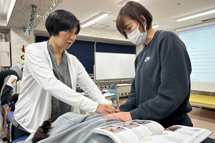 「私の授業では、筋肉がどこからどこまでついているか、筋肉の大きさ、固さ、さらに筋が収縮する感覚を実際に筋肉に触れて確認し、学んでもらいます」。先生の「体表解剖学」では、理学療法士が患者様に効果的なリハビリテーションを行うために不可欠な筋肉について学びます。実践的な授業では、触れた筋肉を圧迫すると、筋肉を緩めることになり、その筋肉がついている場所を引き離すように関節を動かす=ストレッチなど、治療法についても指導を受けられ、理学療法士として臨床現場で活かせる知識、スキルを身につけることができます。