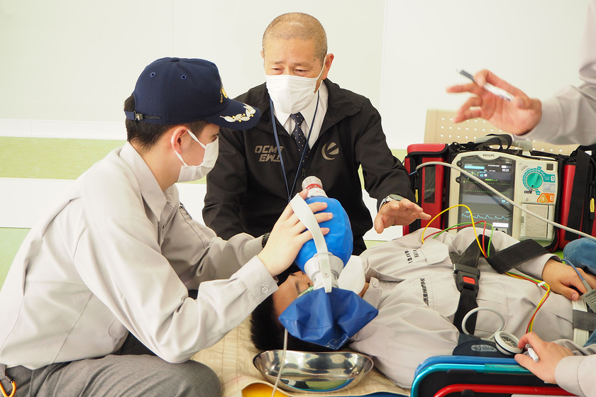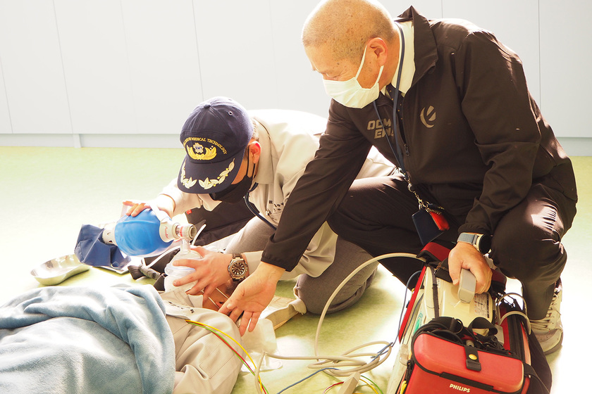 実際の救急現場を想定したシミュレーション実習は、消防吏員救急救命士にとっても多くの時間をかけて訓練している重要な項目です。様々な想定訓練を行う事で、救急現場に出動した際に、慌てず自身の能力を発揮することができます。医療は救急現場から始まっています、救急救命士は最初に傷病者に接触し、自身の知識・技術に基づいた処置を行い医療機関へ繋げる役目を担っています。その病院前医療の技術を究め身に付けていきます。