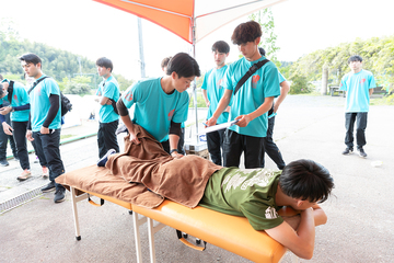業界とともに人材を育成する「産学連携教育」により、豊富な実習を通じて、さまざまな競技の現場を経験することができます。競技ごとに選手の動きやケガの特徴は異なり、それぞれに合わせたサポート方法を学ぶことで、幅広い知識と専門性が身につきます。この経験が、将来どのようなフィールドで働くことになっても活躍できる即戦力となり、確かな自信につながります。さらに、スポーツ業界では多くの専門家が連携して選手を支えていることから、その重要性を学ぶために、総合校の特長を活かして複数学科が合同で実習を行います。ケガの予防からリハビリ、パフォーマンス向上まで、現場で各分野の専門家と関わりながら多職種連携の力を身につけていきます。