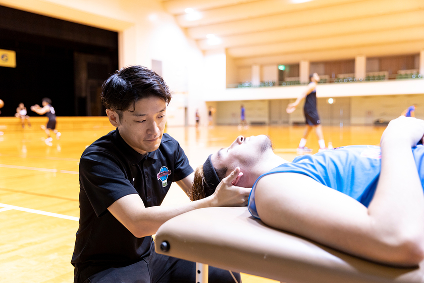 プロバスケットボールチーム「佐賀バルーナーズ」/柔道整復科/2009年卒/スポーツトレーナーを志し、柔道整復師の資格を取得。卒業後は整骨院に勤務し、プロチーム発足前から、佐賀バルーナーズの選手を支える。その活動を通じてチームとのご縁をいただき、専属トレーナーとしての道へ。創設以来、B1リーグチームの一員としてチームを支え続けている。
