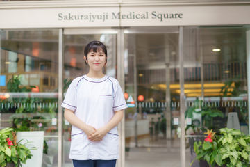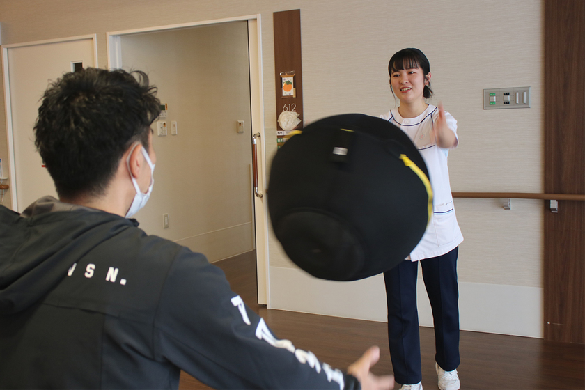 医療法人福岡桜十字 桜十字福岡病院勤務/理学療法科/2022年卒/高校3年次、祖母が病気になり、リハビリに励む姿やリハビリの先生とのやりとりを楽しそうに話す姿を見て理学療法士という職業を知り、自信も将来こうなりたいと思うようになった。勤務する桜十字福岡病院は、研究や学会発表に熱心に取り組み、実績も豊富であるため、自己研鑽のできる場として魅力を感じた。同病院は研究活動も盛んで、桜十字福岡病院で研究機関の登録を行い、大学や企業と共同でリハビリ機器の開発なども手掛けている。現在は理学療法士として回復期病棟に所属。他職種と連携を取りながら患者さんが元の生活に戻れるようリハビリを提供し、在宅復帰の支援をしている。