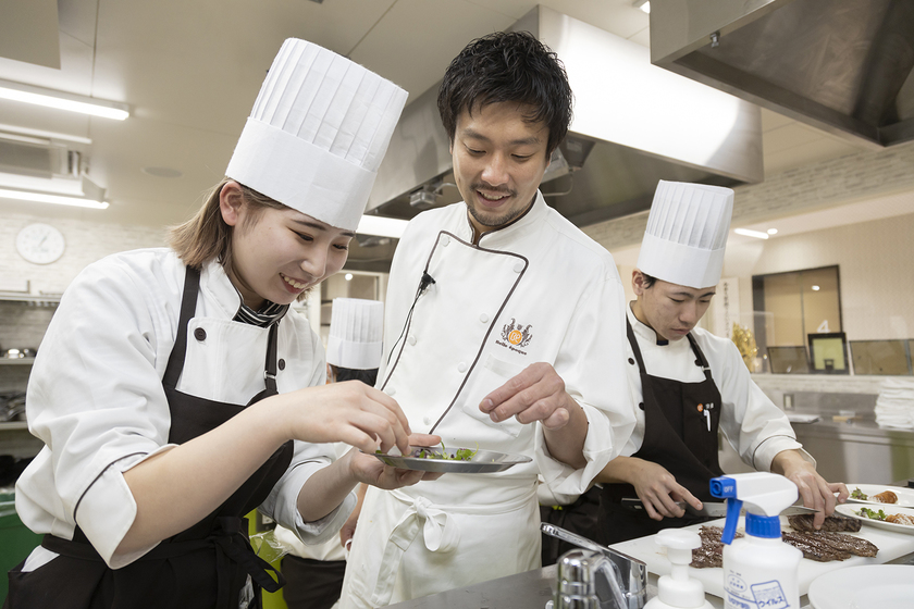 特別授業では、下國先生が考案したレシピで実際に調理を体験。レシピどおりに作るのではなく、仕入れた食材の状態やその日の感性に応じて、“今、この瞬間の最高の一品”になるよう随時アレンジする一流の技術を体感できる。このような“いきた料理”を通じて、「料理は作業ではなく創作であり、無限の楽しさを秘めたものであることを感じてもらいたいです」と下國先生は言う。また、授業後に試食タイムもあり。現在、新レストランのオープン準備中によりシェフ業は休業中のため、先生の料理を食べられるのはここだけだ。