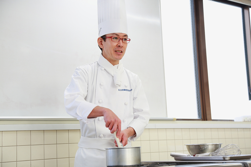 調理の中でも製菓は少し特殊です。例えば洋食の場合、牛がいてそれをステーキにする上流→下流の作業ですが、製菓の場合は逆。卵、小麦粉、砂糖などの材料を合わせてケーキという形を作っていく積み上げの発想です。様々な材料から、全く新しい別のモノが生まれる感動。その可能性は無限です。その表現をより広げるために、授業では理論を重視しています。例えば、卵に砂糖を加え泡立てる際「100g入れるとどうなるか」「減らしたら?」「増やしたら?」「熱を加えたら?」というように、なぜどうしてと結果を学びます。どんなにたくさんのレシピを覚えても、理論を知らなければそれはひとつの点で終わってしまいますが、理論と合わせて学ぶことでそれが繋がるのです。1+1が3にも4にもなる。応用力となり将来に生かすことができます。