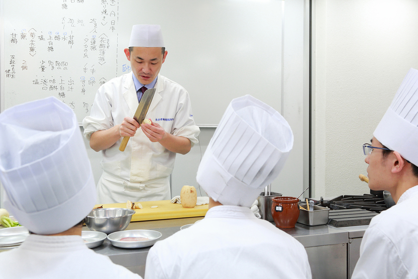 専門分野:日本料理。工業高校卒業後、飛び込んだ料理の世界。努力した分だけ力になる日本料理に魅了されていったという。京都の料理旅館からキャリアをスタートさせ、ホテルや割烹料亭で経験を積み、料理長まで上り詰めた後指導の道へ。業界のために恩返しがしたいという先生の思いに応えるように、授業はもちろん放課後も、教室には生徒たちの活気が溢れる。各々取り組みたいことを自由に真剣にと、指導にも熱が入る。