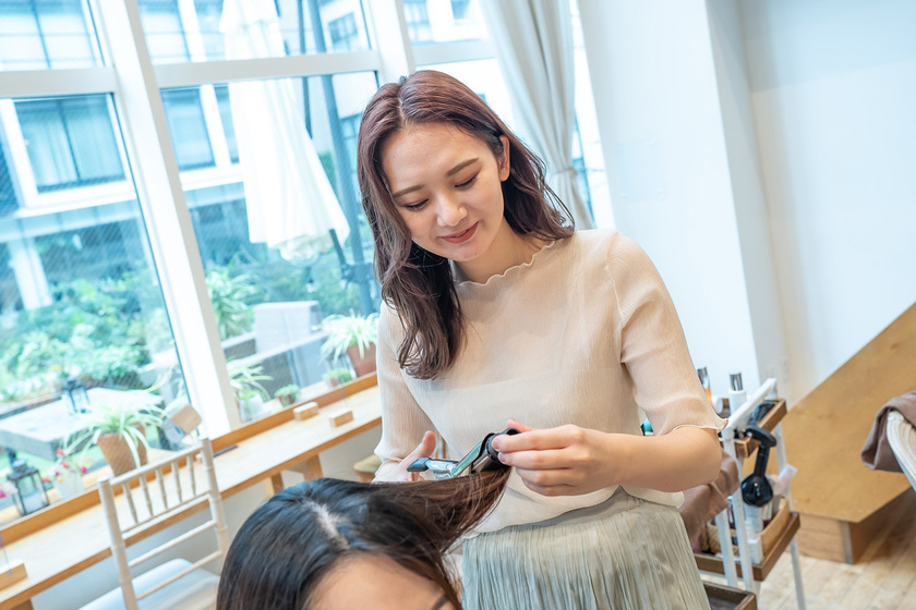 現在は、表参道にあるサロンVioletでアシスタントを務めています。Violetは、「韓国ヘア」をいち早く提案してきたサロンのひとつ。また、表参道というエリアもトレンドの発信地であるため、流行が誕生する瞬間を毎日見かけるような刺激的な現場です。私自身も、いつか次のトレンドを創造することができるかもしれない…そんなわくわくできる職場で働くことができて、とても幸せです。Violetのもうひとつの特長は、ヘアメイクアーティストとして活躍するスタイリストが多いところ。先輩のアシスタントとしてヘアメイクの現場を訪れるチャンスがあり、より多彩な経験を積むことができています。
