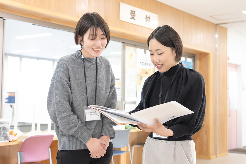 河内長野市 市民保険部 健康推進課/公務員総合コース/2022年卒/生まれ育った河内長野市で、市民の健康を支えるべく日々仕事をこなす西出さん。基本の電話対応、業務の書類作成や管理をはじめ、健康増進事業に関する研修会や教室への参加など、「事務」といってもその仕事の幅はとても広い。3年目を迎え、後輩を指導することも増えたが、教える立場だからこそ改めて仕事への向き合い方を見直していると謙虚な姿勢を見せる。「市に勤めているので、今後別の部署でも働くと思います。でも、どの部署に行ってもこの地域で暮らす人々の支えになりたいという気持ちは変わりません」と、地元愛の強さを語ってくれた。