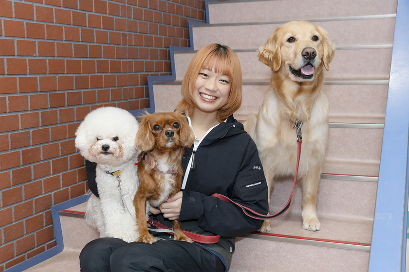 卒業後も一緒に過ごせるパートナードッグ制度や、学外にも訓練場所が多いところが魅力です。先生や仲間と協力しながら、プロの技術と絆を深められる最高の環境です。