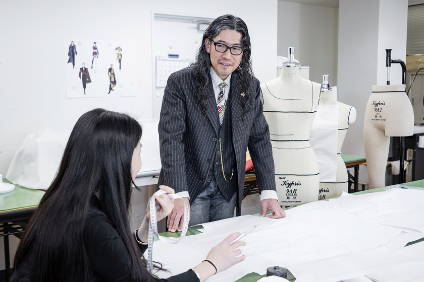 小田切先生の授業では、デザイン画より型紙を作成するパタンメーキング、トルソー(人体模型)に布を当て立体的に型紙を作るドレーピング技術などを身につけ、ファッションに関する幅広い知識を学びます。少人数なので、時にはマンツーマンで授業が受けられるほどの贅沢な環境。個性を活かした表現方法について一緒に考え、一人ひとりと寄り添いながら丁寧なものづくりを進めます。また銀座「松屋」の系列学校という利点を活かして、百貨店で活躍しているバイヤーからリアルな現場経験や生の声が聞ける授業を取り入れているのも特長です。