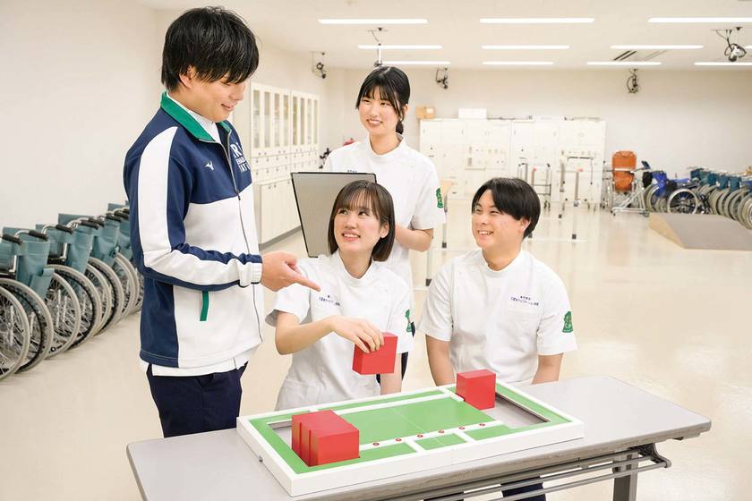 授業は活発で和やかな雰囲気に包まれており、学生たちはグループ学習に積極的です。仲間同士で支え合いながら学ぶ姿勢が、国家試験に向けた確かな力につながっています。質問しやすい環境づくりを大切にしているからこそ、グループ内での意見交換やクラス全体での発言も活発。1年生の頃は遠慮がちだった学生も、学びを重ねるうちに自信を持って意見を言えるように成長しています。理解が深まったときに生まれる「なるほど!」という声は、4年生で迎える国家試験への大きな一歩となり、作業療法士としての確かな成長を実感させています。