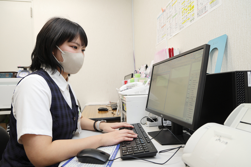 社会医療法人 愛仁会 井上病院/医療事務コース/2024年卒/医療事務の業務はレセプト業務や外来受付・会計などが知られているが、Nさんの業務はMA(メディカルアシスタント)として医師の診療支援や医療文書の代行作成など、より医療の現場に近いところで業務をおこなう仕事だ。最初は戸惑うことも多かったというが、先輩や現場の手厚いサポートもあり大きく成長を遂げている。また患者や行政からの問い合わせに一人で対応できることも増えたことが、会話の中にも自信として感じられる。「現在の科は1日に多くて30人程度ですが、他の診療科だと1日100人以上対応することもあるので、今から経験を積んで対応力を磨き、早く一人前になるのが目標です!」