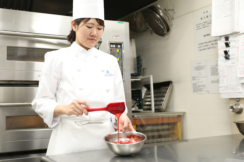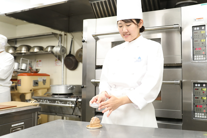株式会社ホテルプリンセス京都/製菓・製パン系コース/2023年卒/当初はパティスリーの個人店への就職を考えていた田近さんだが、製菓の技術を深める中で、さまざまなお客様との出会いの機会が多いホテルへの就職を希望するように。「自分が作ったケーキをきっかけに、またこのホテルへ来ようと思ってもらえたら」と語る。就職1年目からホテル内のショップで販売するケーキの考案・製造を担当。納得いくまで試作を重ね、先輩のアドバイスを参考に、理想に近づけようと努力する姿勢は学生時代から変わらない。「まだまだ学ぶことはたくさんあります。今後も知識と技術を磨きながら、五感で楽しむことができるようなスイーツを提供していきたいです」。