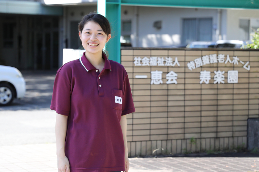 特別養護老人ホーム 寿楽園/介護福祉士コース/2022年卒/介護の業界を目指す前は法律にも興味があったという池尻さん。仕事を考える中で、人に「ありがとう」と言ってもらえることや、自分の将来に対し、介護の知識や経験があった方が良いのではないかと考えたのだそう。将来の進路に悩んだときは、「将来、自分のスキルとして、あったら嬉しいものを選ぶ方が良いと思います」と、進路に悩む後輩たちへのアドバイスをくれた。