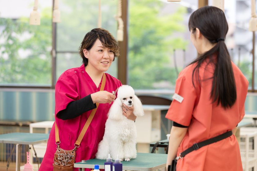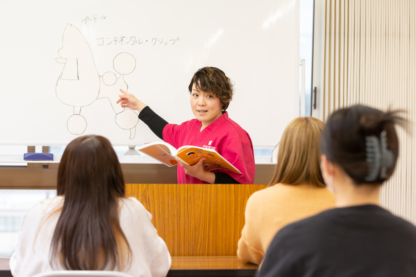 トリマーはやりがいのある仕事です。技術はもちろん大事ですけど、お客様は「人」につくものだと思っています。頼られるようになったり、感謝されたり、そういう特別な人になれる瞬間がうれしいです。学生の中には犬が好きで入ってきたはずなのに、挫けてしまう子もいます。毎回同じ犬種じゃないから、昨日までは上手くできていたのに、今日の犬だと上手くいかないとか。だけど、最初はできなくて当たり前なんです。私たち教員も納得のいくまで丁寧に指導しますし、お友達みたいな距離感で、なんでも相談できる関係を築けるように努めています。時には恋愛相談も受けますよ。だから辛いな、厳しいなと思っても逃げずに、何か一つでもいいからやり遂げられる自分を持ってほしい。それを乗り越えた先にトリマーとしてのやりがいに出会えます。