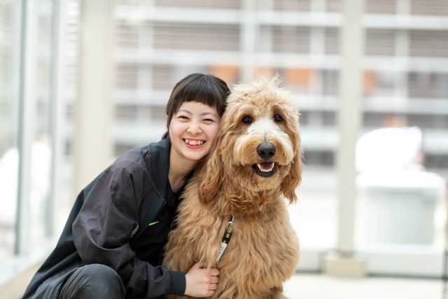 セラピー犬を育成するには、ワンコが学校に来て6ヶ月目までのトレーニングがとても重要。どのくらい人を好きになってくれるかが大切なので、たくさんの人に抱っこしてもらい、人の温度に慣れさせます。私はセラピー活動のリーダーをしていますが、セラピー犬の育成は一人ではできません。トレーナーや動物看護など様々な専攻の学生から専門的なアドバイスをもらい、みんなで協力し合うことで、セラピー犬は育っていきます。