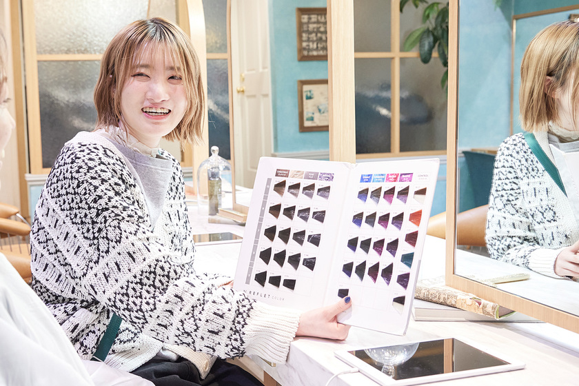 サロンではカラーやシャンプー、ドライヤーなどを担当し、勤務時間後にはカットモデルでの練習も続けています。最初の頃はカラーで失敗してしまったこともあり、入社してからの3か月ほどは泣いてばかりいましたが、そのたびに先輩が声をかけて助けてくれました。努力を続けた結果、少しずつできることが増え、今ではお客様からシャンプーを褒めてもらえたり、ヘッドスパで指名をいただけるようにもなりました。会話がはずんで「楽しかった」と言ってもらえたときや、自分の技術を認めてもらえたときは、もっと頑張ろうというモチベーションにつながります。