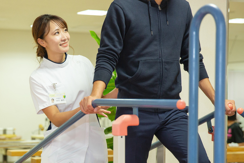 座る、立つ、歩くといった基本動作能力の回復や維持、障がいの悪化の予防のために運動療法や物理療法を用いてリハビリテーションプログラムを作成し、実行します。リハビリ前は「大変そう…」と思われる患者様もいますが、気持ちに寄り添いながらプログラムを考え、一緒にやっていくうちに本人も家族もびっくりするほど回復される例もあります。「おかげで歩けるようになりました」と感謝されると、一緒にリハビリを頑張ってよかった!と嬉しい気持ちでいっぱいになります。
