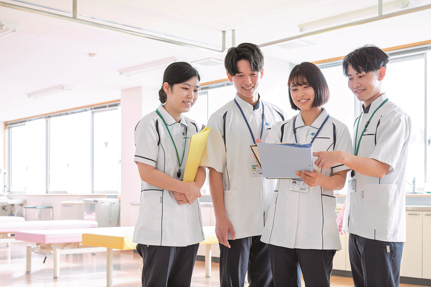 実際の医療現場では、理学療法士と作業療法士は常に連携して患者様のリハビリにあたります。人は病気や事故で身体が不自由になったり、精神的なダメージによって心の病に冒されたりと、いつも健康とは限りません。傷ついた人たちに寄り添い、励まし、明るい道へと導いていくために、理学療法士と作業療法士は患者様の身体と心の両面からサポートしていく必要があります。富士リハでは理学療法学科と作業療法学科の両方を設置しており、さらに1年次から、学科を超えた交流や症例検討会が行われているため、対象となる患者様や疾患に対し、理学療法士と作業療法士がそれぞれどのように連携しながら対応していくのかを深く学ぶことができます。