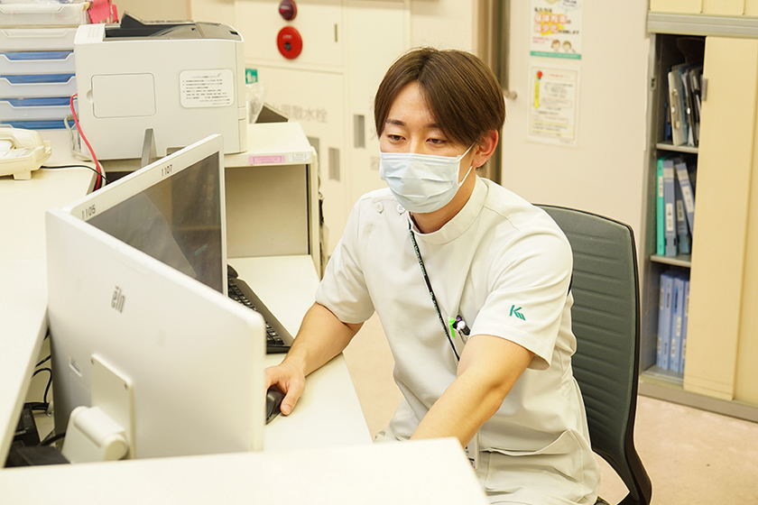 私は循環器内科や心臓血管外科の治療を受ける患者さんを対象としたHCU(高度治療室)に勤務しています。HCUとは重症度がICU(集中治療室)と一般床の間の患者さんが入室する病棟で、ICUから状態が回復して入室してくる方も一般床で状態が悪化して入室してくる方もいます。ICUから移ってくる方は歩くこともままならない状態で入室することも多いのですが、治療が進み、体が少しずつ動かせるようになっていく喜びをご家族や医療スタッフと分かち合えることが大きなやりがいです。今後も患者さんの回復を適切にサポートするとともに、さらに医療行為の一部が可能となる特定行為看護師を目指すなど、スキルアップに励んでいこうと思っています。