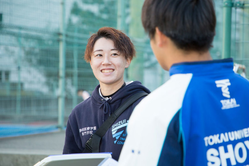 元々スポーツが好きでスポーツ選手を支える側になりたいと思ったのがきっかけです。高校の部活でスポーツトレーナーに出会い、この道を目指そうと思いました。専門学校は在学中からトレーナー活動ができるシズイに入学。トレーナー部(現在のトレーナーコース)に入部し県内高校ラグビー部に配属され、様々なトレーナーの方との出会いや、柔道整復師の資格を活かした活動、教科書では学べない現場での経験、何よりもチームを支える一員となり、高校生活をラグビーに捧げる高校生たちと同じ方向を目指す仲間になることを経験し、この仕事を選びました。