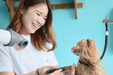 私がオーナートリマーを務める「dogsalonHuggies」は1日3頭限定のプライベートトリミングサロン。個人でお店を運営していると、大変なこともたくさんありますが、自分が思い描いていた運営スタイルを実現できていることに、日々幸せを感じています。仕事のやりがいを実感するのは、カットの仕上がりにご満足いただけたとき。笑顔の飼い主様を見ると、ワンちゃんもとっても嬉しそうで、そんな時に「幸せの連鎖」を感じます。信頼されるトリマーであり続けるためには学びが欠かせません。カットだけでなく食事や病気に関するセミナーなどに参加したり、他のトリマーさんのSNSを見るなど、日々、技術や知識を吸収しています!
