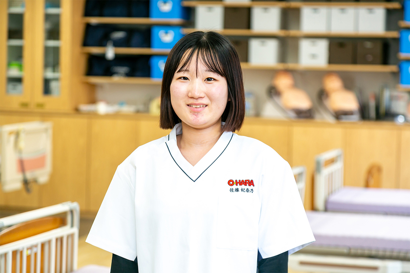 オープンキャンパスに参加した際、優しく生徒に寄り添う指導で、話しやすく明るい先生がたくさんいることが魅力だと感じました。座学や校内実習以外に、介護施設での実習を行えることも大きなポイントでした。