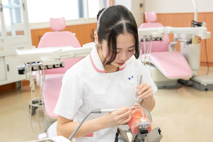 「将来に役立つ医療系の資格を取りたい」と歯科衛生士を目指して勉強中。臨地実習に向けて今まで学んだ技術にさらに磨きをかけるべく努力しているHさんに、この学校の魅力についてお話を伺いました。