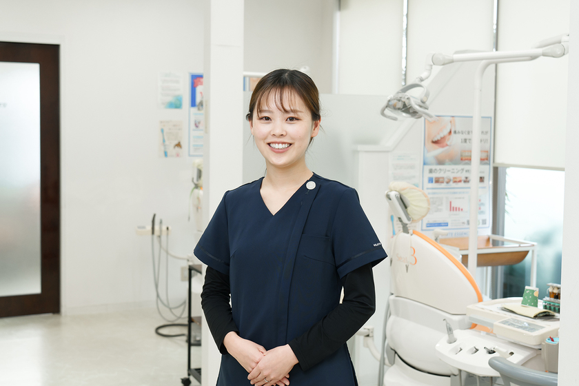 一人ひとりの患者様に深く寄り添う方針に共感。姫路歯科衛生専門学校(Himeshika)の先輩方が多く勤務する安心感もあり、就職を決めました。歯科衛生士の通常業務に加え、ホワイトニングも行っています。診療時間内だけでなく、患者様自身の生活に寄り添うことも私たちの大切な仕事。自宅でできるケアを一緒に考え、症状が良くなると一緒に喜ぶことができます。「ありがとう」と直接言っていただくことも多く、健康に貢献していると実感できます。先輩方が産休に入られるなど、もうすぐ私が一番の年長者になるので、しっかり後輩に教えられるよう頑張りたいです。私自身も産休明けで、現在は時短勤務。一生続けていける安心感があります。