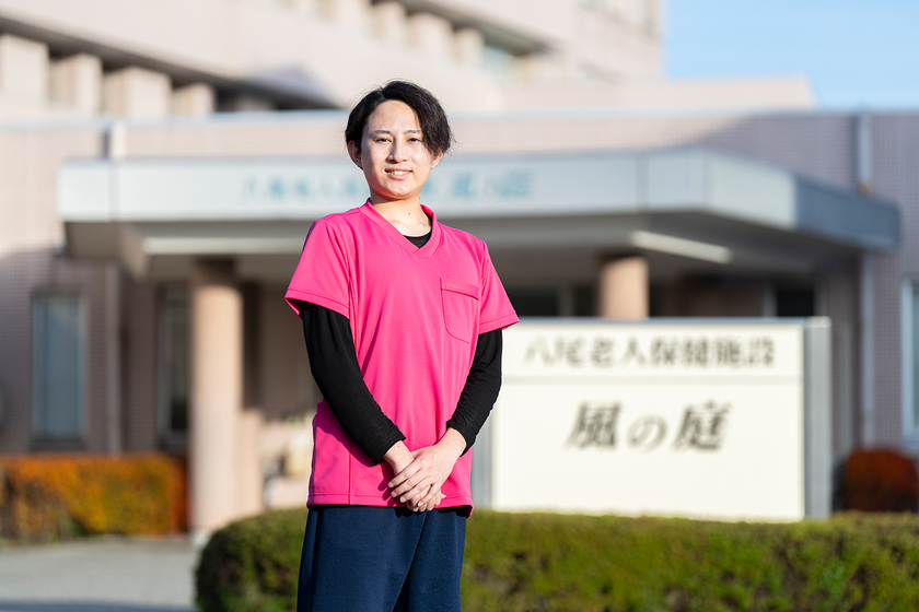 八尾老人保健施設 風の庭/介護福祉学科/龍谷富山高校出身。北陸ビジネス福祉専門学校介護福祉学科で学び、介護福祉士に。富山市にある「八尾老人保健施設 風の庭」に勤め、食事や排せつ、入浴の介助、レクリエーション活動の企画・運営などを通して利用者様の生活サポートを行っています。