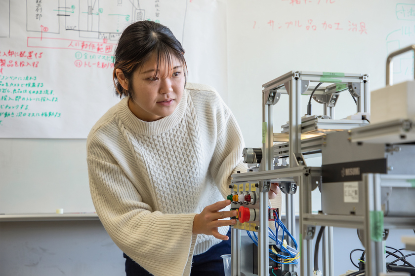 東北職業能力開発大学校 応用課程 生産電子情報システム技術科進学/専門課程 電子情報技術科 卒/2022年卒/中学生の頃からロボットや回路に興味があり、将来は回路設計や電子部品を扱う仕事に就きたいと思い進学。現在は、他学科の学生とチームを組むことが多く、コミュニケーションを一番意識しているそう。お互い知識も得意分野も異なるので、各々が抱える問題や要望を相手に理解できるよう伝えることが、製品を一緒に作り上げる上で大切だと話す。このグループワークを生かし、就職後は他部署の社員とコミュニケーションを円滑に行ってハード・ソフトの両面において創造性や開発力を伸ばしたいと考えているそう。