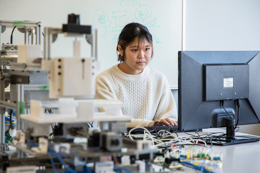 半導体素子等のスペックを理解して一から回路設計をすることに興味深く取り組んでいます。また、ソフトウェアの分野での開発力も伸ばしたいと思い、プログラミング言語を用いて画像処理やソフトウェア開発にも取り組んでいます。他学科の学生と力を合わせ、実際の企業の課題を模した開発を行うので、ハード・ソフトの両面において創造性や開発力を伸ばせるのが特長ですね。開発を始めた頃は完成できそうもないような内容でも、仲間と協力して作り上げたときの達成感は忘れられません。実際に製作物が動いているのを見て、今までの時間はすべて無駄じゃなかったなと感じました。