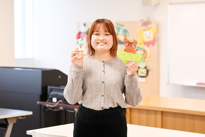 幼稚園教諭と小学校教諭の免許取得を目指して、1年生の今は幼児教育・保育分野を中心に学んでいます。発達や障がいのあるこどもの支え方を学ぶ特別支援論、教育心理学といった座学から、ピアノ基礎演習や造形表現、模擬保育などの実践的な授業など、初めて学ぶことばかりですが、知識が増えていくのは楽しいです。