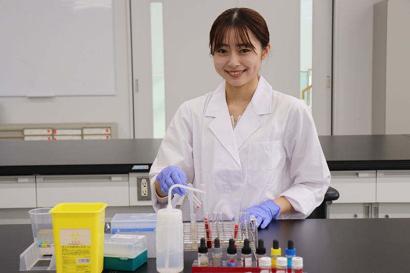 もともと理科に興味があり、検体に薬品を入れると試薬の色が変わったり、検査結果が数値にはっきり表れる“実験”を行うのが好きです。授業の中では特に、分析系の実験を行う実習が楽しいです。