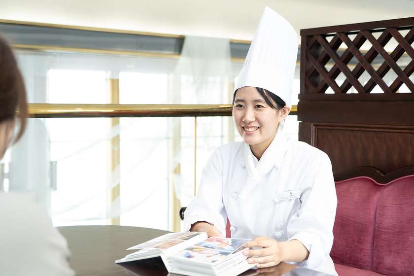 ホテルのレストランでパティシエとして働いています。最近はウェディングケーキづくりに携わることが多くなりました。まずお客様と打ち合わせをしてどのようなケーキにするのかを検討した後、ケーキを作り、挙式当日はケーキの設置も行います。何より嬉しいのは、やはりお客様に喜んでいただけること。打ち合わせから挙式当日までは日が開くことが多いのですが、お客様が私のことを覚えていてくれ「イメージ通りのケーキを作っていただいて本当にありがとうございます」と声をかけてもらえたときには本当に嬉しかったです。パティシエは職人ですが、接客も大切な仕事の一つ。これからもお客様に喜んでいただけるケーキを作りたいですね。